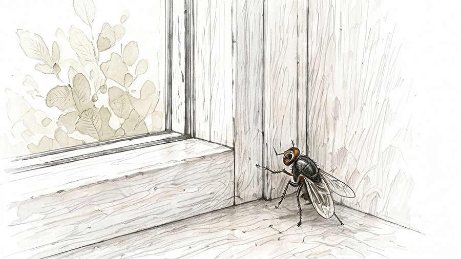 Mouches concentrées autour des lampes, fenêtres ou points chauds.